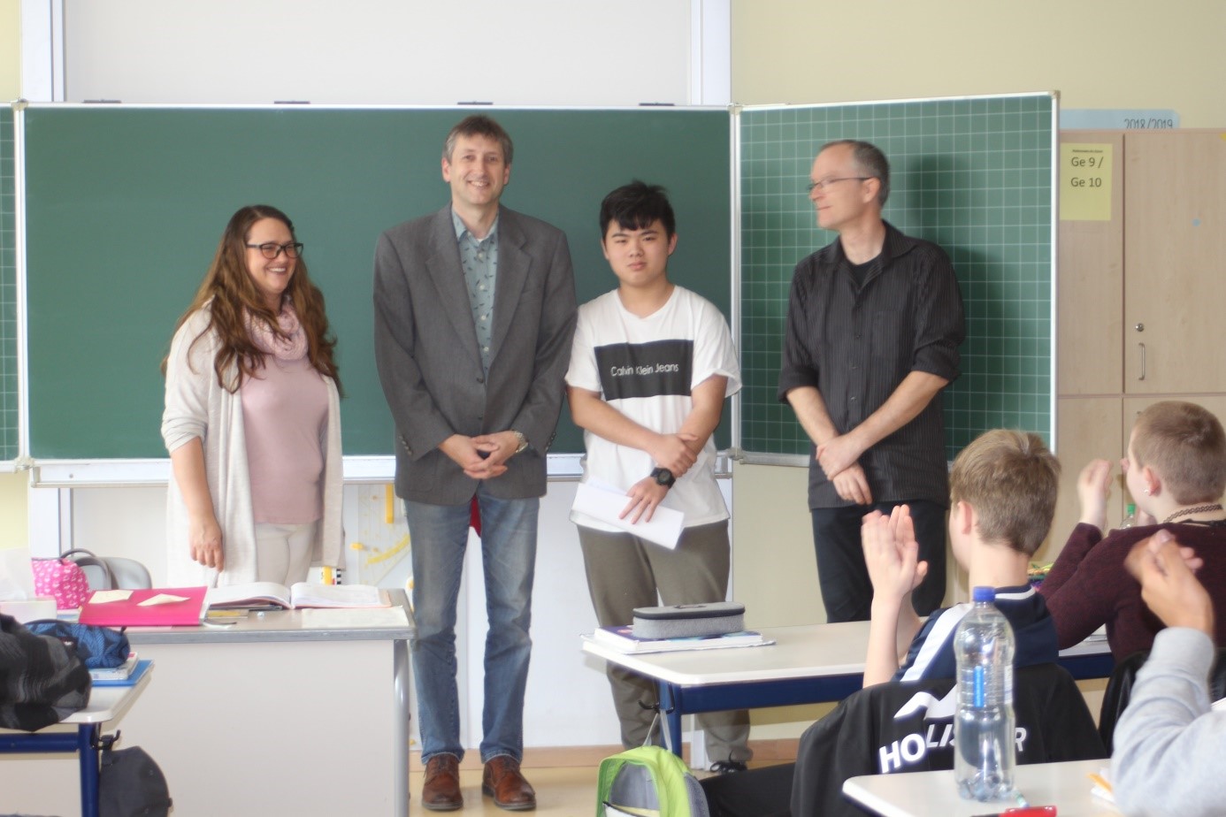 Patricia Felten (Mathelehrerin), Peter Schäfer (stellv. Schulleiter) Eric Li, Dirk Rosenauer-Mieheim (Mathematik-Koordinator)