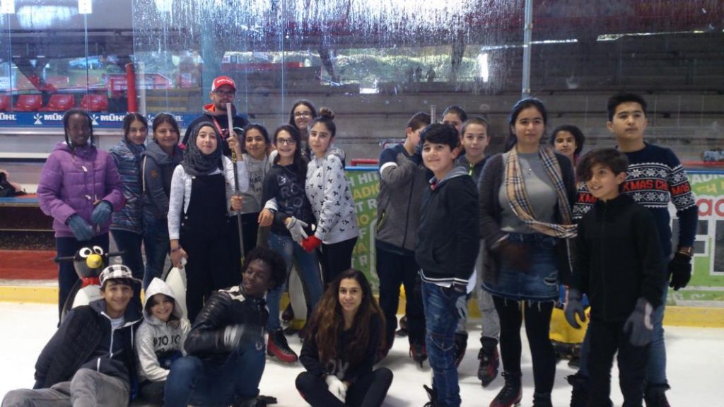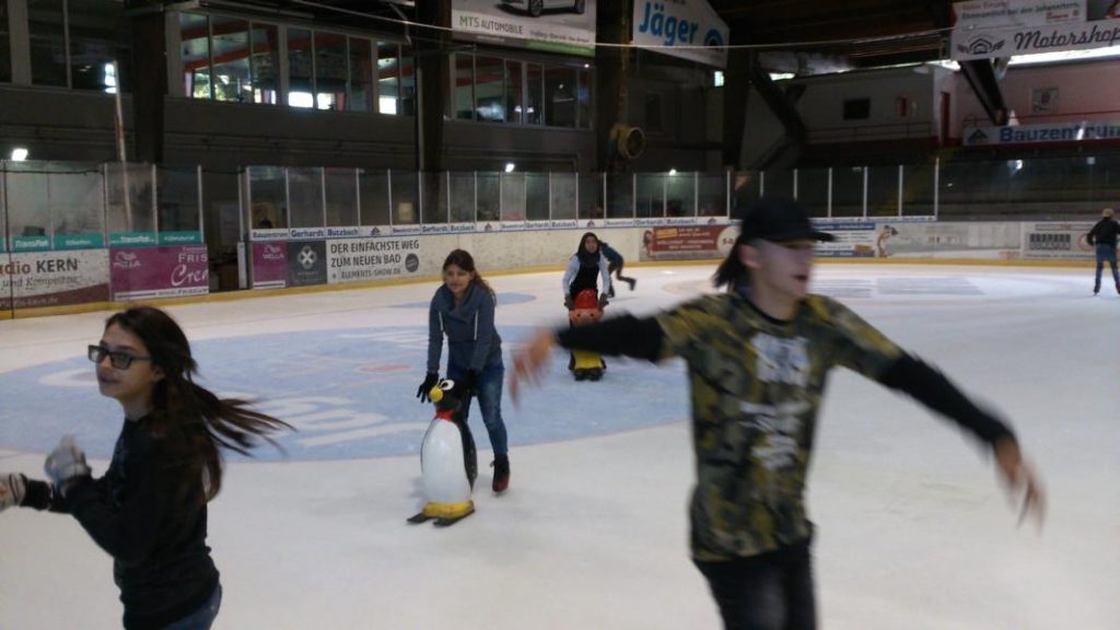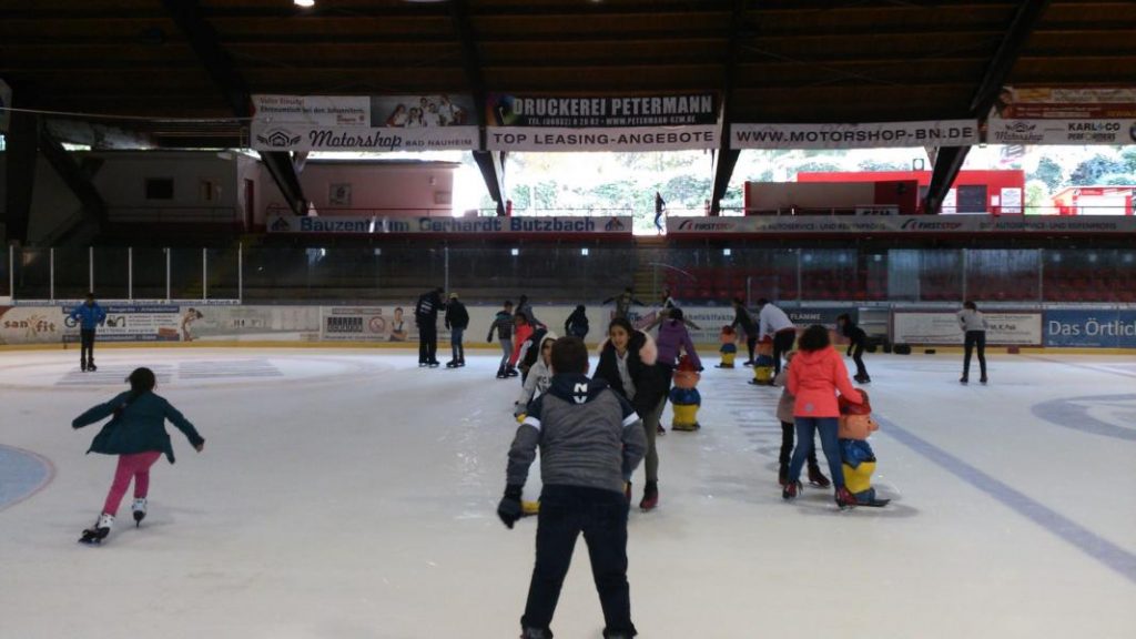 Am 21.09.2017 haben die Roten Teufel vom Eishockeyclub Bad Nauheim und der Internationale Bund Schülerinnen und Schüler zu einer kostenfreien Eislauf- Schnupperstunde eingeladen. Dieses Angebot im Rahmen der Interkulturellen Wochen 2017 nahmen die beiden Intensivklassen der Henry-Benrath-Schule Friedberg sehr gern an. Integration auf dem Eis sozusagen. Für die 29 Kinder und Jugendlichen war dieser Nachmittag ein großes Erlebnis. Für 2 Stunden den Alltag und die Sorgen der Vergangenheit zu vergessen- eine tolle Idee der Organisatoren und dann in die strahlenden Augen zu sehen, vor allem wenn man wie viele der Kinder noch nie auf dem Eis gestanden hat. Am Ende erhielt jeder Teilnehmer noch ein Geschenk zum Abschied. Erschöpft, aber glücklich traten die Lehrerinnen Frau Diedicke und Frau Hoppe-Reinhardt mit den 29 dann die Heimfahrt mit dem Zug an. Am nächsten Tag erzählten alle voller Freude von dem wunderbaren Nachmittag auf dem Eis und dass sie gern wiederkommen würden.