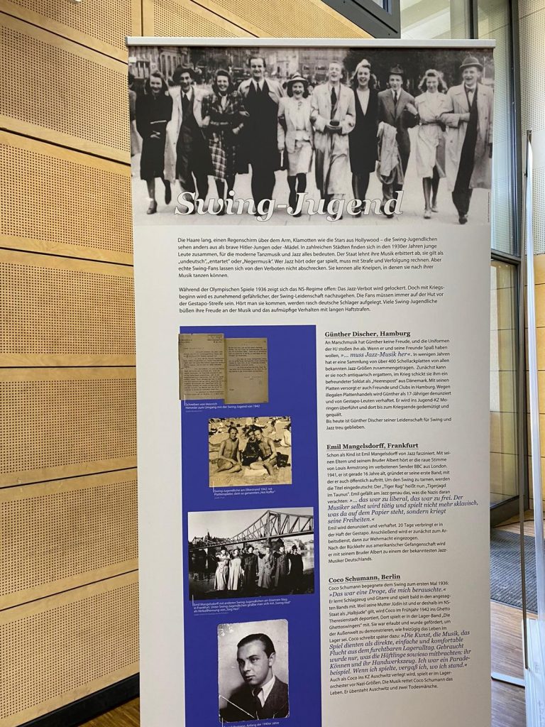 Es war für uns Schüler*innen erschreckend, mit welchen für uns heutzutage alltäglichen Kleinigkeiten man sich vor nur knapp 77 Jahren noch in Lebensgefahr brachte, weil das NS-Regime diese Handlungen nicht duldete und verfolgte. Ein Beispiel, das ich nennen möchte, war Günter Discher, der während des NS der sogenannten „Swing-Jugend“ angehörte, einer passiven Widerstandsgruppe, deren Mitglieder sich durch ihre „langen Haare, Regenschirm und Kleidung wie Hollywood-Stars“ aus der Menge hervortaten. Günter Discher sammelte Jazz- Platten und versorgte mit seiner umfassenden Sammlung Freunde und Clubs aus ganz Hamburg. Er wurde mit nur 17 Jahren von der Gestapo verhaftet und wegen illegalen Plattenhandels bis zum Ende des Krieges 1945 im Jugend- KZ Moringen gedemütigt und gequält.