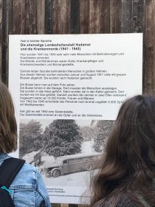 Unsere Exkursion zur Gedenkstätte Hadamar startete um circa 9 Uhr an der Schule. Nach einer knapp einstündigen Fahrt sind wir dann in Hadamar angekommen und haben erste Eindrücke der Gedenkstätte wahrgenommen. Wir bemerkten, dass nur wenige Meter entfernt von der damaligen „Irrenanstalt“ eine neue Psychiatrie eingerichtet wurde. Diese Tatsache hat uns alle doch stark verwundert – bei dieser Geschichte.