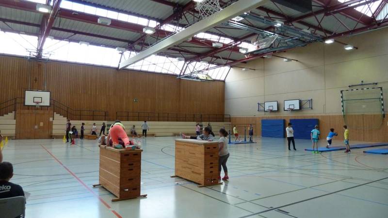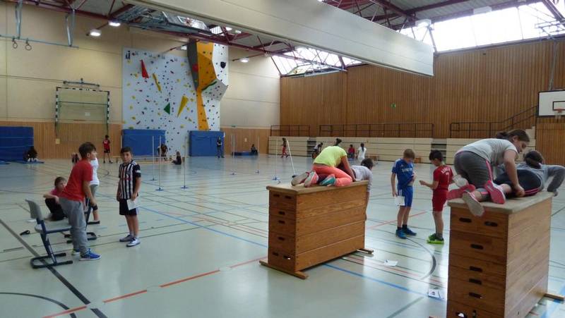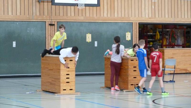 Seit nunmehr 4 Jahren verwandelt sich die Schulturnhalle der Henry-Benrath-Schule in der Zeit nach den Herbst- bis zu den Weihnachtsferien in ein großes Fitness- Studio. Drei Klassen üben mit ihren Sportlehrerinnen bzw. Sportlehrern an 20 aufgebauten Stationen Kraft, Geschicklichkeit, Kondition und vor allem Fitness. Jede Stunde beginnt mit einem gemeinsamen „warm up“. Dann geht es partnerweise an die Stationen. An den Wänden hängen Übungskarten, auf denen die Aufgaben beschrieben und bildlich dargestellt sind. Am Ende gibt es ein gemeinsames „cool down“. Alle haben Spaß und trainieren fleißiger, als in manch anderer Stunde. Warum? Im Hintergrund läuft moderne Popmusik, die Stations- und Partnerwechsel werden angesagt. Das spornt die Kinder und Jugendlichen noch mehr an und gibt eine Struktur vor, bei der die drei Lehrerinnen und Lehrer Zeit haben, die Schüler/innen individuell zu fördern, zu motivieren, Fehler in den Übungsausführungen rechtzeitig zu korrigieren und Lernfortschritte zu beobachten. Außerdem ist das ein echtes Gesamtschulprojekt. Hier wird inklusiv und jahrgangsübergreifend gearbeitet, denn die Schülerinnen und Schüler treffen aus verschiedenen Schulzweigen und unterschiedlichen Jahrgängen aufeinander. Auch inklusiv beschulte Kinder und Jugendliche und unsere zwei Intensivklassen sind mittendrin dabei. Sport geht eben auch ohne Sprache. Da hilft der Große dem Kleinen an die Reckstange zu kommen, man lernt sich gegenseitig zu unterstützen, sich zu motivieren, über Erfolge zu staunen und sich gemeinsam darüber zu freuen.