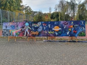 Bereits in der siebten Klasse war Graffiti Unterrichtsgegenstand im Fach Kunst bei Aysa Elliot und es wurden Skizzen für das anstehende Projekt angefertigt und ausgewählt. Zur Stärkung der Klassengemeinschaft und der Verbesserung des Klassenklimas wurden diese Ideen schließlich im aktuellen Schuljahr an einem Projekttag umgesetzt. Der Austausch von Gedanken sowie das Erleben von Produktivität in gemeinschaftlicher Arbeit war eine prägende Erfahrung für die Jugendlichen, die während der Phasen des Lockdowns häufig für sich arbeiteten. Das entstandene Kunstwerk verschönert nun den Klassenraum und erinnert an die gemeinsame Aktion.