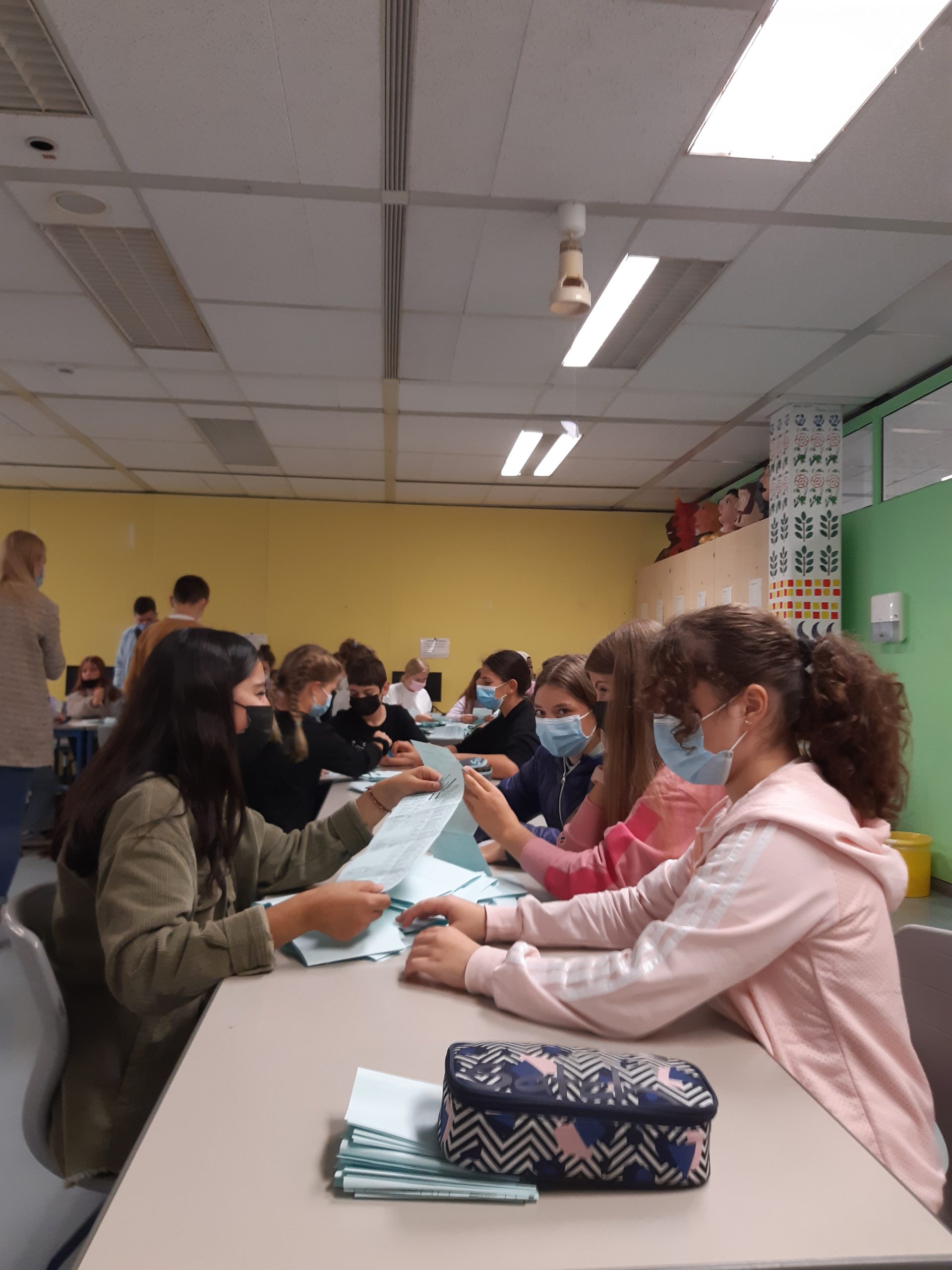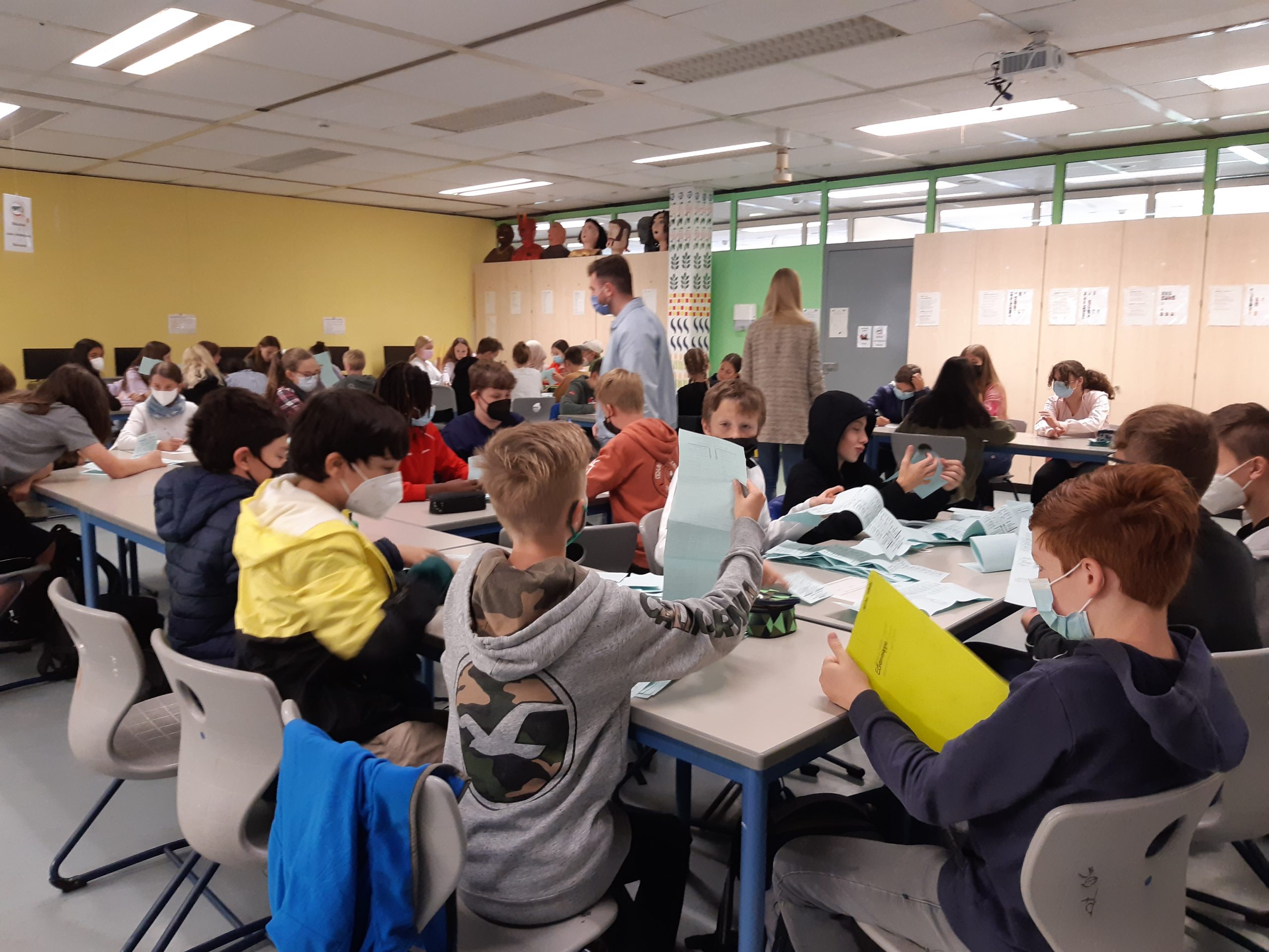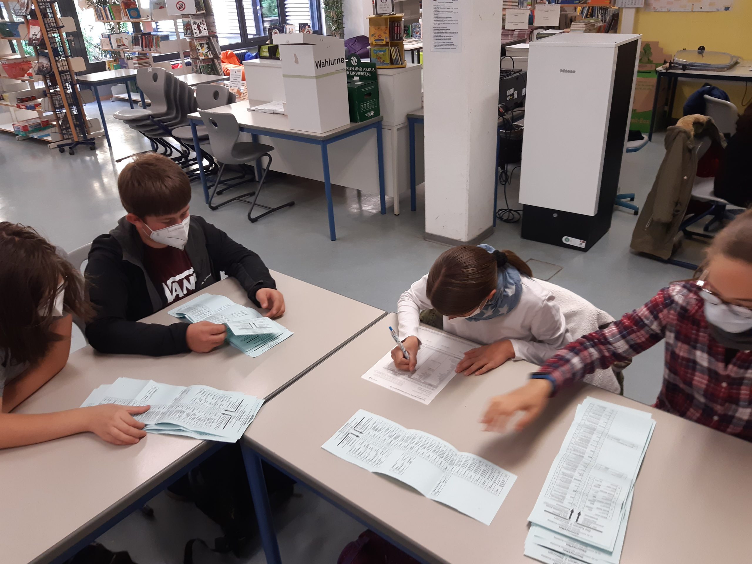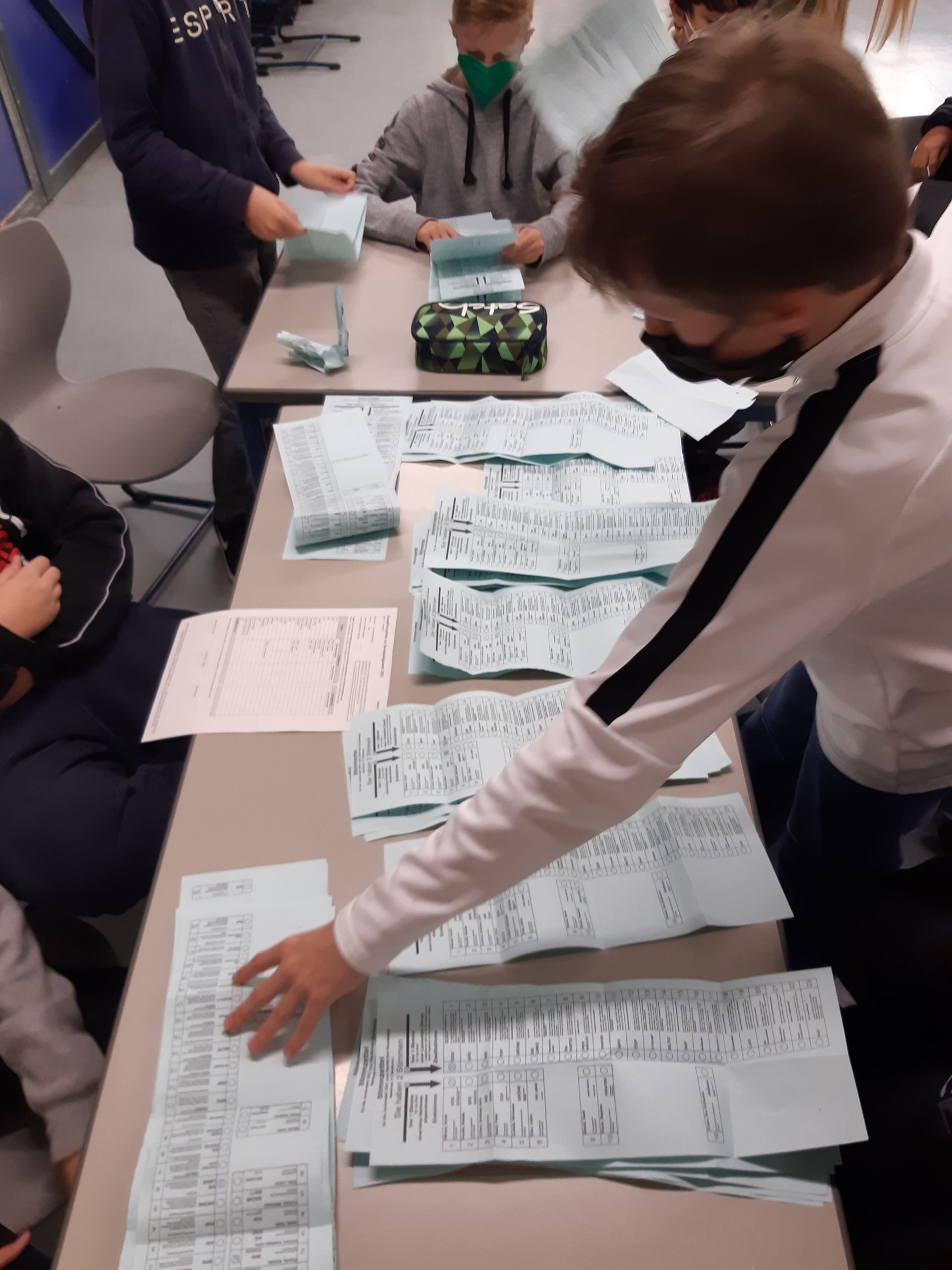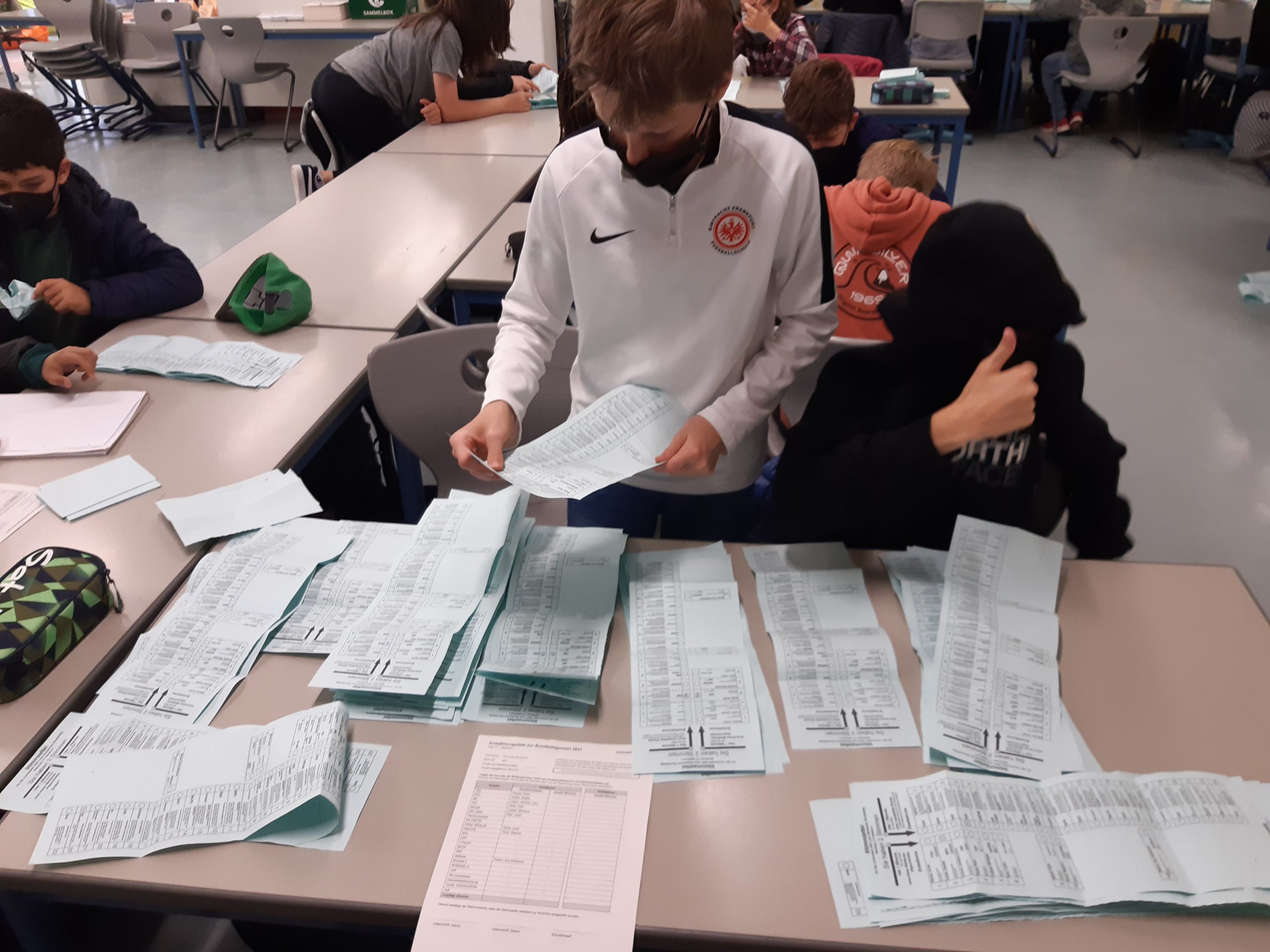 Dank der tatkräftigen Unterstützung der Klassen 7G1 und 7G3 konnten alle Stimmzettel ausgezählt und das Wahlergebnis ermittelt werden. Das offizielle Ergebnis wird in den nächsten Tagen verkündet.