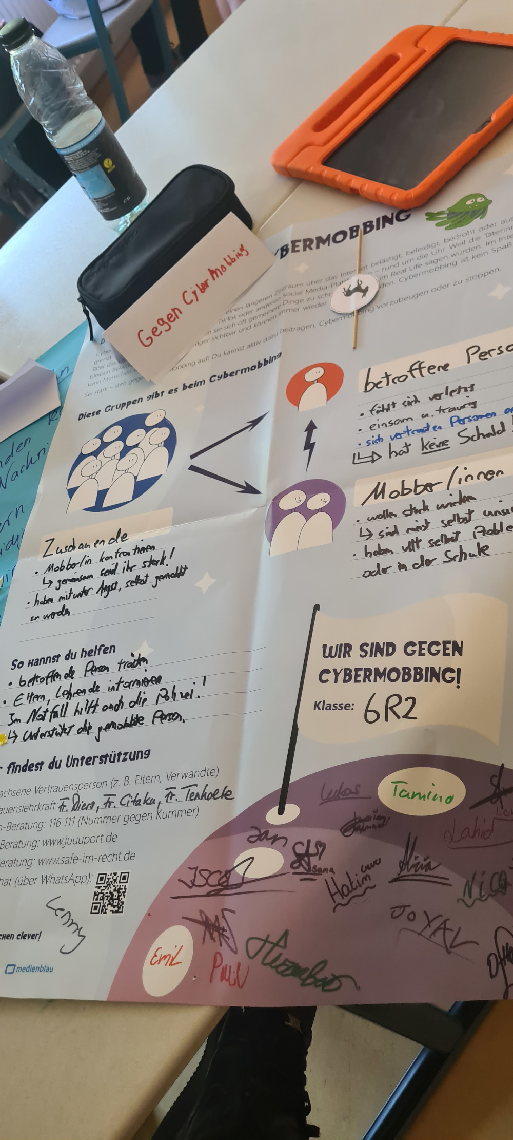 Abschließend, am 2.7.25 wurde von jeder Klasse das Erlebte präsentiert- dies geschah in Form von Videos, Mitmachstationen, Tagebüchern oder Plakaten. Während ein Teil der Klasse sich in der Schule umschauen und die Produkte der anderen Klassen bestaunen konnte, blieb ein anderer Teil der Kinder im Klassenraum und erläuterte den Besuchern seine Präsentation.
