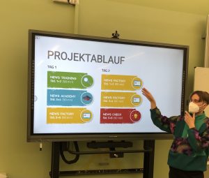 Der Projektablauf war in die Bereiche „News Training“ und „News Factory“ aufgeteilt und die Klasse konnte während der beiden Tage nicht nur aktive und kreative Erfahrungen mit sogenannten Click Bates und Fake News sammeln, sondern setzte sich auch mit Fragen des Urheberrechts und konkreten Faktenchecks aktiv auseinander. Dabei stand der Erwerb von Medienkompetenz im Nachrichtendschungel klar im Vordergrund.