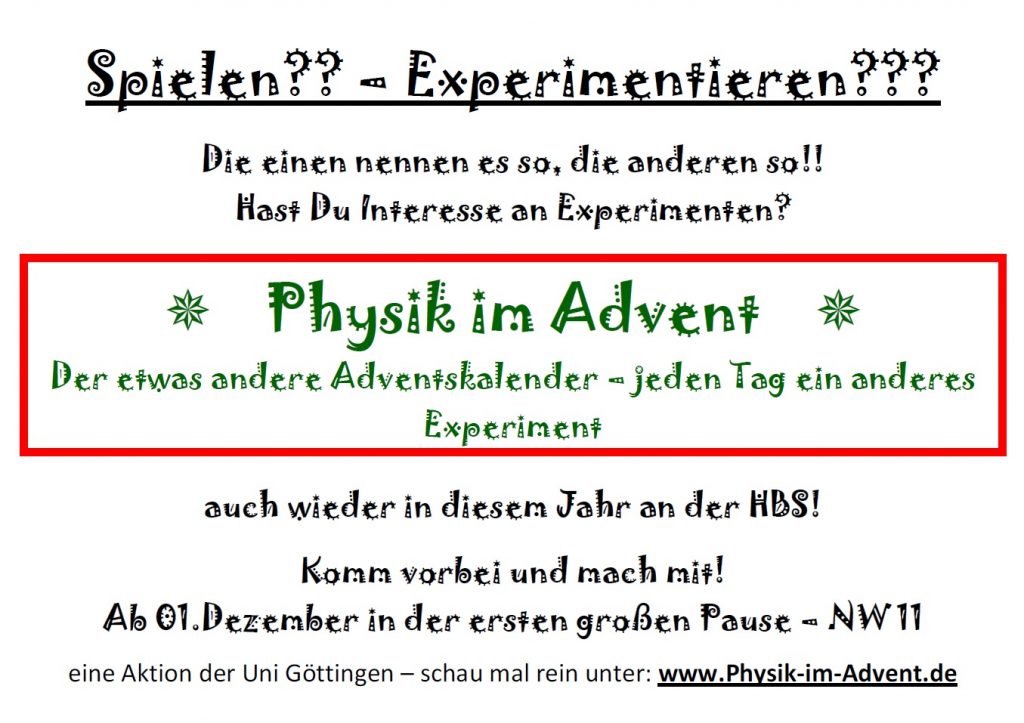 Liebe Schülerinnen und Schüler, der Advent ist da und damit auch „Physik im Advent 2018“ veranstaltet von der Uni Göttingen. Die Physik-Fachschaft möchte in diesem Jahr wieder „Physik im Advent“ an die HBS bringen. Seit 2014 führen wir in der Adventszeit das „PiA-Experiment des Tages“ an der HBS an jedem Schultag in der ersten großen Pause mit allen interessierten SchülerInnen durch.